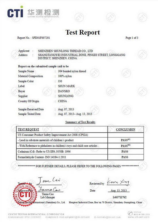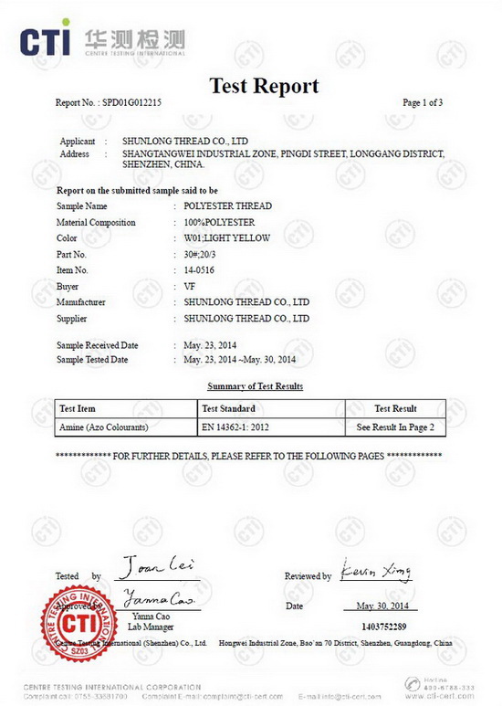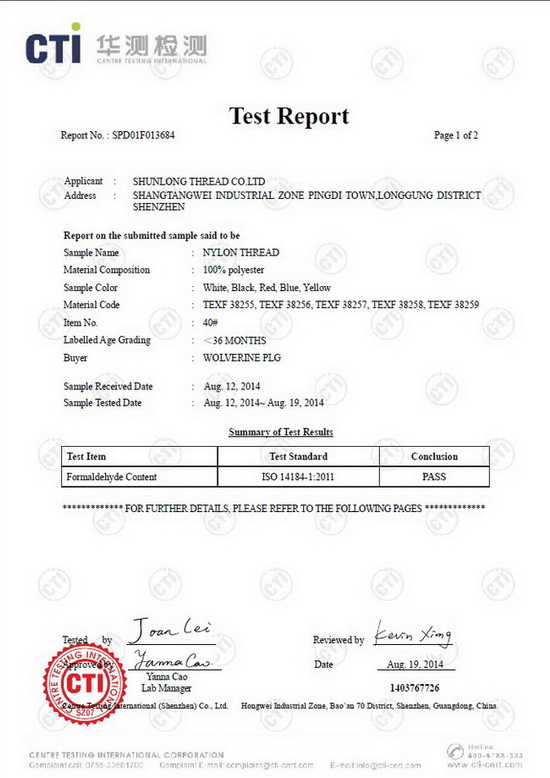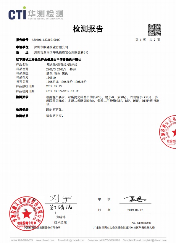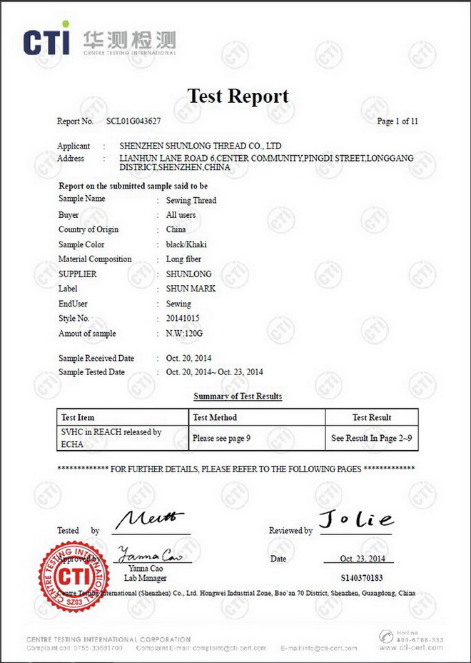 每年為客戶(hù)提供縫紉線(xiàn)REACH、ROHS、不含AZO等環(huán)保報(bào)告