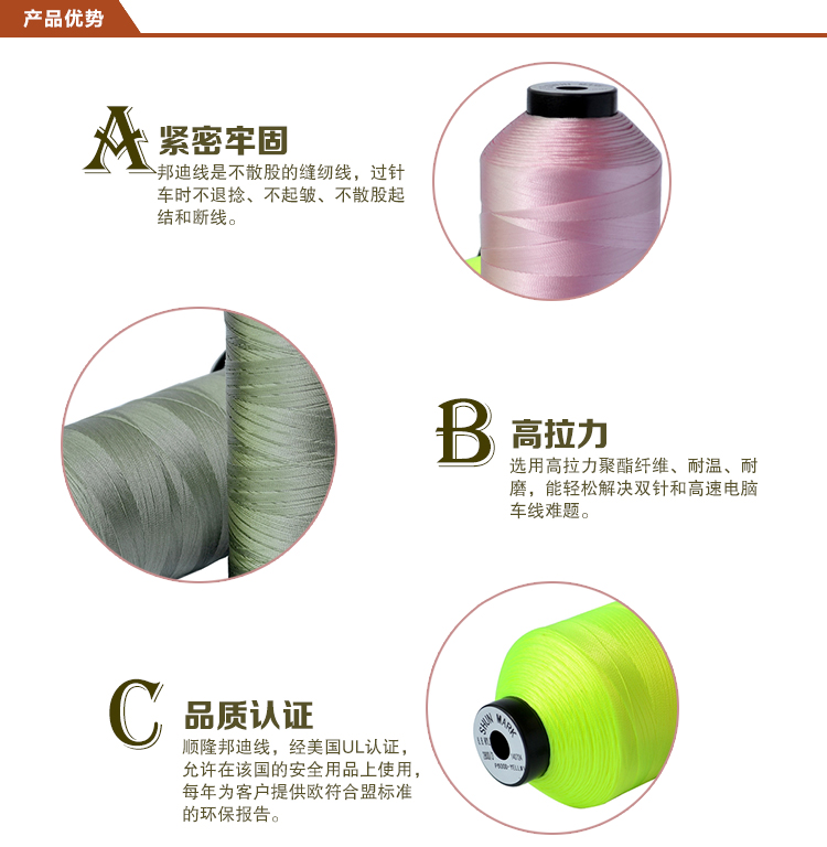 不散股縫紉線的特點:邦迪線是不散股的縫紉線,特點是高拉力、耐溫、耐磨度強。