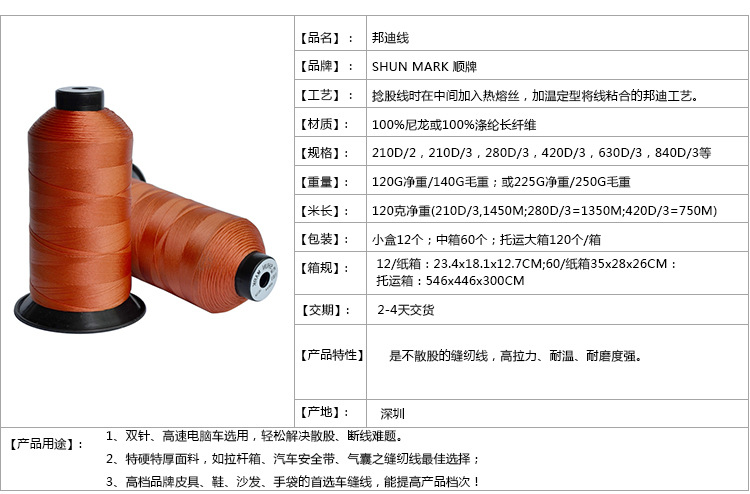 尼龍邦迪縫紉線的應(yīng)用:1、雙針、高速電腦車選用,輕松解決散股、斷線難題。2、特硬特厚面料,如拉桿箱、汽車安全帶、氣囊之縫紉線最佳選擇;3、高檔品牌皮具、鞋、沙發(fā)、手袋的首選車縫線,能提高產(chǎn)品檔次!