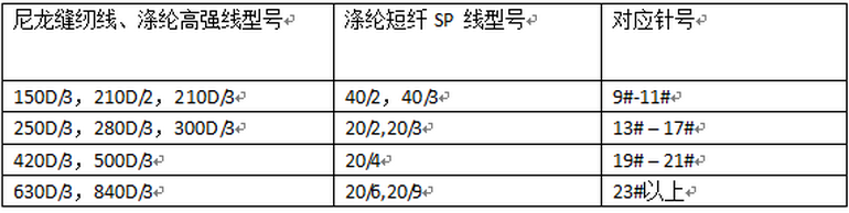 三、厚料,箱包、運(yùn)動(dòng)鞋、織帶包邊等厚料,用到的線型號(hào)一般是尼龍縫紉線滌綸高強(qiáng)縫紉線的420D/3,500D/3或者是滌綸短纖SP縫紉線的20/4等;選用19號(hào) – 21號(hào)的針。