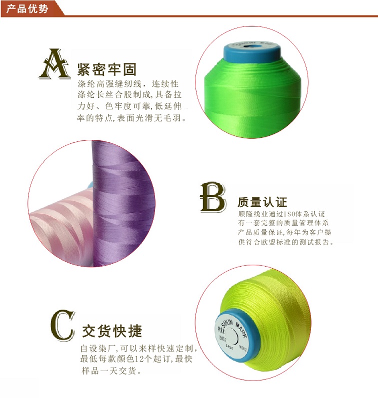 滌綸縫紉線的應(yīng)用:滌綸線產(chǎn)品成熟穩(wěn)定,價(jià)格低廉,廣泛應(yīng)用于制衣、家紡、PVC人造皮革縫制品行業(yè),是一款性價(jià)比高的紡織輔料產(chǎn)品。