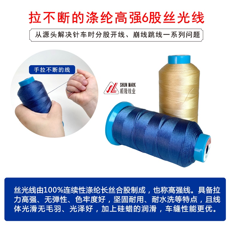 滌綸長絲縫紉線的特點(diǎn):線質(zhì)柔軟,表面光滑無毛羽,染色溫度130攝氏度,色牢度好,滌綸纖維拉長比適中大概8-12%,長絲縫紉線拉力強(qiáng)度好,延伸率低,加上道康寧硅油的潤滑,針車實(shí)用性較強(qiáng)。