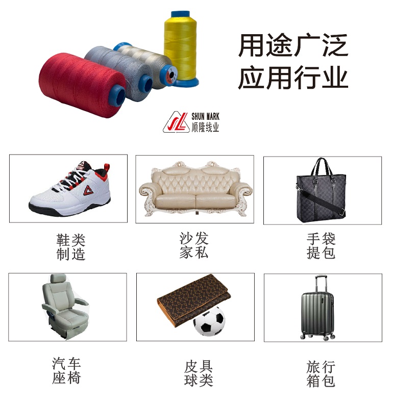 【尼龍66邦迪線的應(yīng)用】:1、雙針、高速電腦車選用,輕松解決散股、斷線難題。2、較硬加厚面料,如拉桿箱、汽車安全帶、氣囊之縫紉線的選擇;3、皮具、鞋、沙發(fā)、手袋的車縫線,能提高產(chǎn)品質(zhì)感!