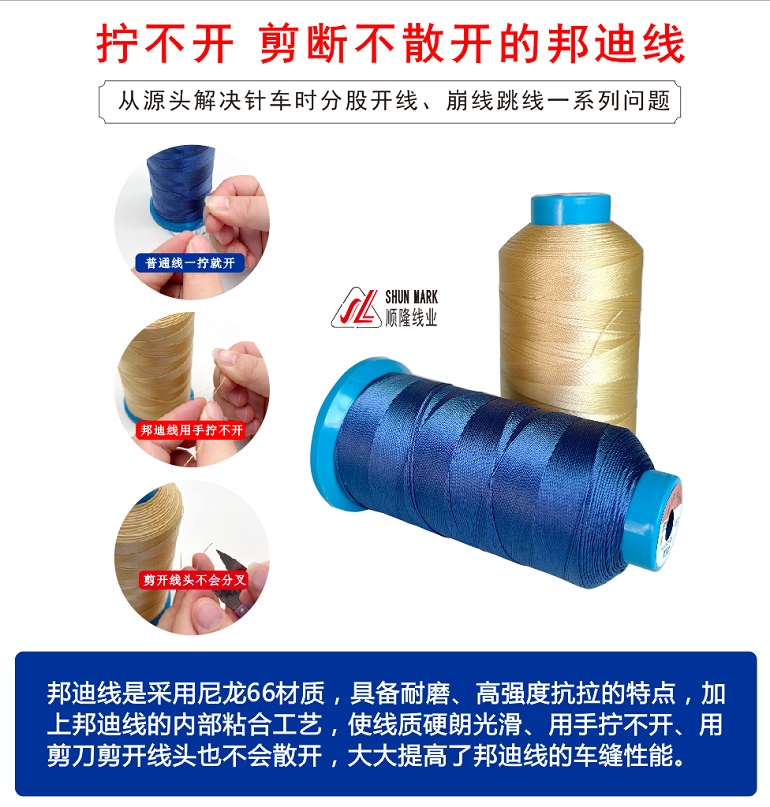 【尼龍66邦迪線的特點(diǎn)】:邦迪線是不散股的縫紉線,用手順時針是擰不開的,這就是邦迪線區(qū)別于其他縫紉線比較簡單的方法,邦迪線的特點(diǎn)是尼龍66材料的高拉力、耐溫、耐磨度強(qiáng)。具備良好的車縫性能,能勝任3000或以上轉(zhuǎn)速的現(xiàn)代高速縫紉機(jī)使用。也是我們的主打產(chǎn)品。