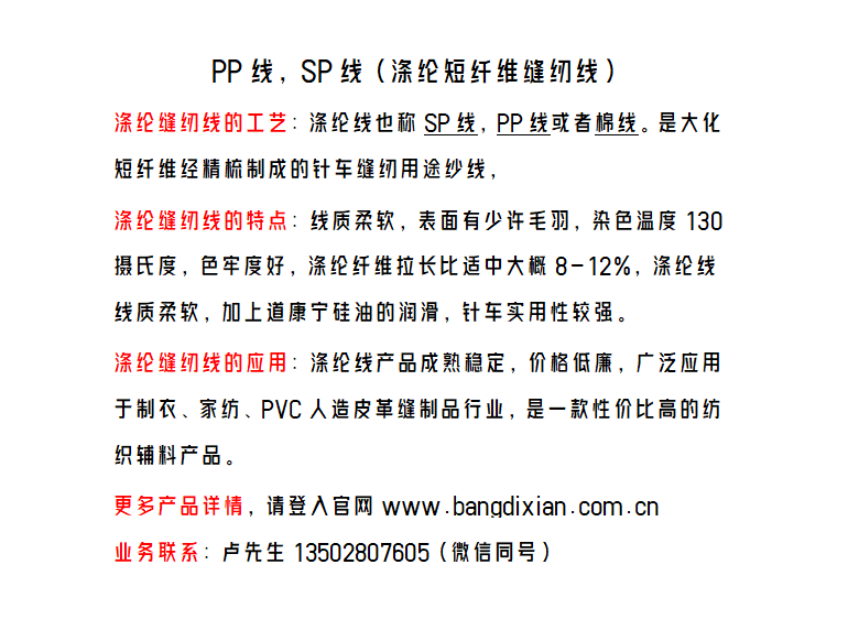 更多滌綸線 縫紉線 封包線 SP線 PP線產品信息,聯(lián)系盧先生13502807605(微信同號)
