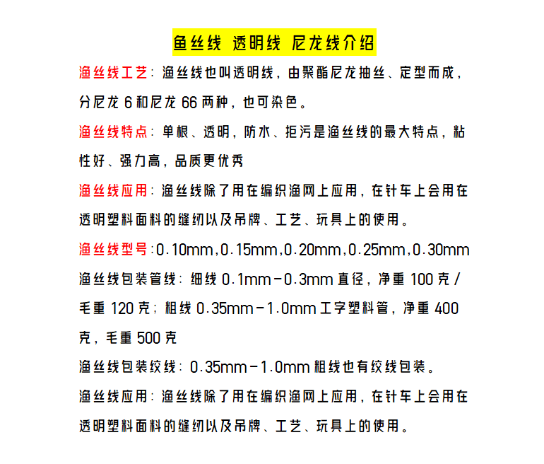 供0.12mm現(xiàn)貨彩色漁絲線100%尼龍單絲魚絲線假發(fā)飛織用途;漁絲線,彩色魚絲線,尼龍線,單股尼龍線