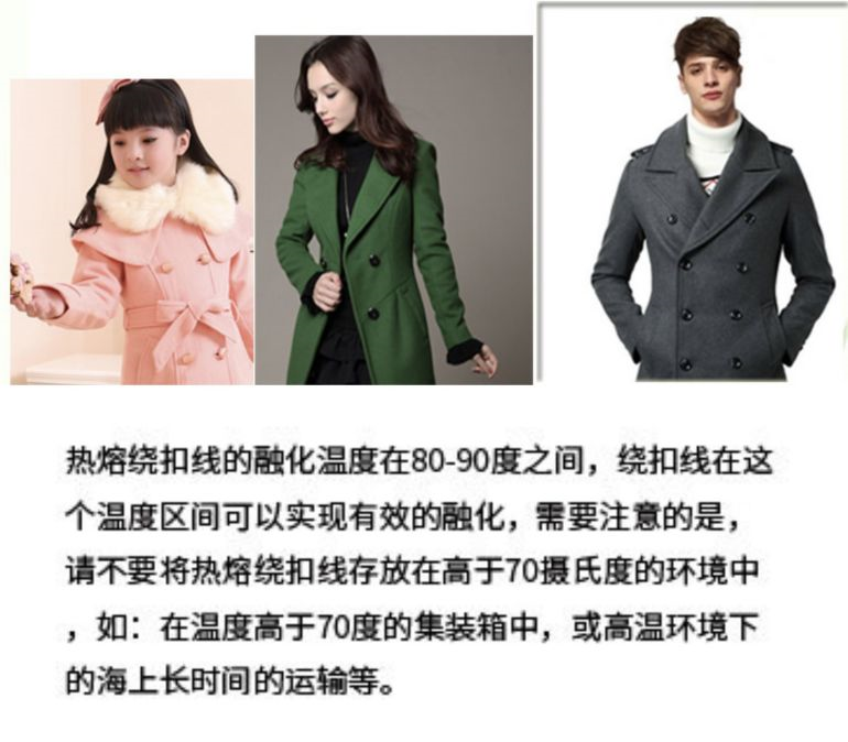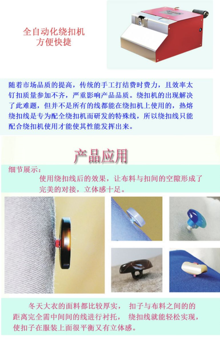 熱熔繞扣線是一種用于衣物繞扣固定的縫紉線,通常由氨綸和錦綸等材料制成。通過熱熔的方式將紐扣固定在衣物上,熱熔線需要專用的繞扣機器配合,機器繞好以后會白動加熱使得線融化為一個整體,讓布料與紐扣間的空隙形成了完美的對接,立體感十足。設(shè)計師看中的是這種繞扣方法所產(chǎn)生的整體感,而管埋者看重的是節(jié)約了大量的人工。避免了傳統(tǒng)釘扣線容易斷線和扣腳松塌的問題。隨著市場品質(zhì)的提高,傳統(tǒng)的手工打結(jié)費時費力,且效率太低扣質(zhì)量參差不齊,嚴重影響產(chǎn)品品質(zhì)。全自動繞扣機的出現(xiàn)解訣了此難題,但并不是所有的線都能在繞扣機上使用的,熱熔繞扣線是專為配全繞扣機而研發(fā)的特殊線,所以繞扣線只能配合繞扣機使用才能使其性能發(fā)擇出來。