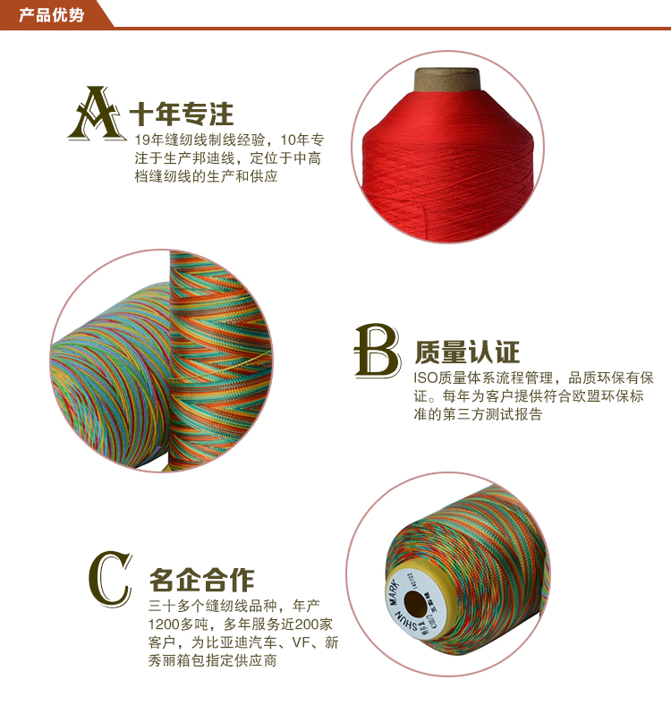 高彈絲拷邊線特點(diǎn):高彈絲具超強(qiáng)的伸縮彈性和膨松性,能配合彈性面料所要求的可伸縮性來(lái)進(jìn)行縫合;