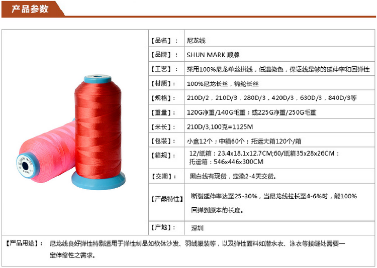 尼龍縫紉線的工藝:采用100%尼龍單絲拼線,低溫染色,保證縫紉線足夠的延伸率和回彈性。