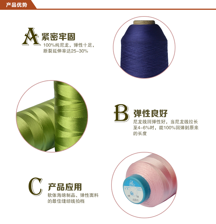 尼龍縫紉線的優(yōu)勢:100%純尼龍,彈性十足,斷裂延伸率達(dá)25-30%;尼龍線回彈性好,當(dāng)尼龍線拉長至4-6%時,能100%回彈到原來的長度;軟體海綿制品、彈性面料的最佳縫紉線拍檔。