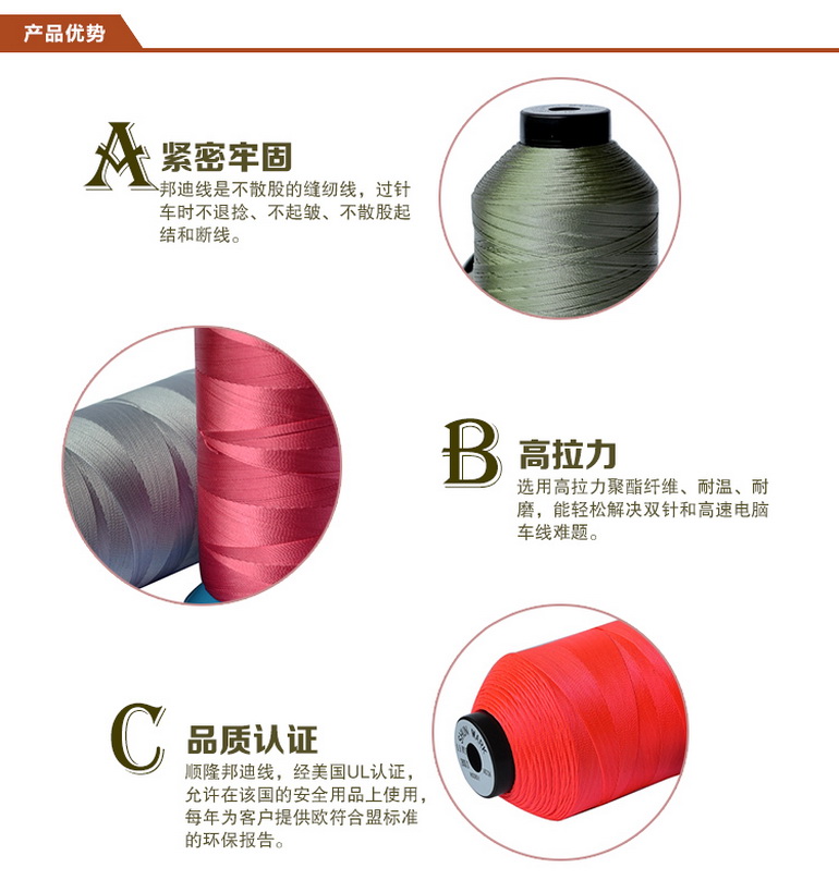 尼龍66邦迪線的特點(diǎn):杜邦邦迪線是不散股的縫紉線,特點(diǎn)是高拉力、耐溫、耐磨度強(qiáng)。