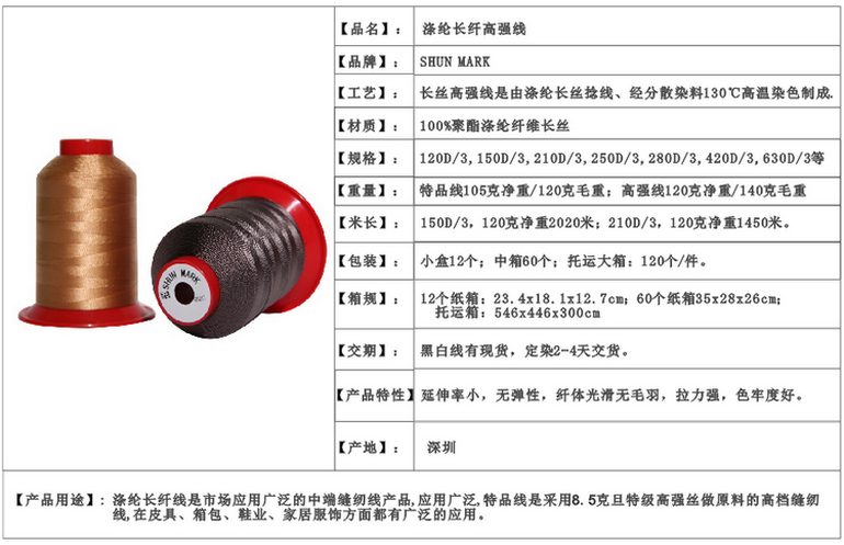 特品線的工藝:采用8克旦100%polyester滌綸長絲合股捻線、單線定型、配合高性能的蠟油潤滑的高檔無彈性縫紉線。