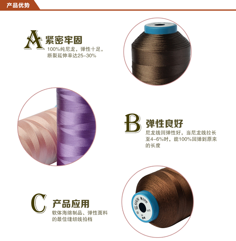 漁網(wǎng)線的優(yōu)勢(shì):100%純尼龍,彈性十足,斷裂延伸率達(dá)25-30%;尼龍線回彈性好,當(dāng)尼龍線拉長(zhǎng)至4-6%時(shí),能100%回彈到原來的長(zhǎng)度;軟體海綿制品、彈性面料的最佳縫紉線拍檔。