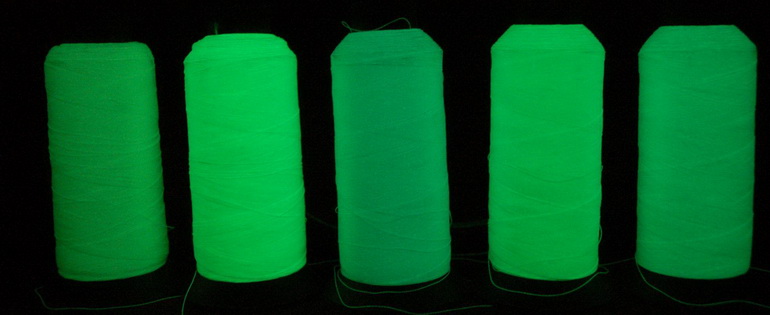夜光線工藝:是利用稀土發(fā)光材料制成的功能性纖維新材料,經(jīng)特種紡絲制成夜光纖維制成紗,捻成的縫紉線。