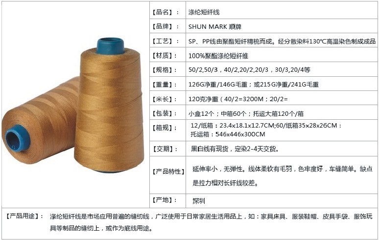 馬克線的應(yīng)用:滌綸短纖線是市場(chǎng)應(yīng)用普遍的縫紉線,廣泛使用于日常家居生活用品上,如:家具床具、服裝鞋帽、皮具手袋、服飾玩具等制品的縫紉上,或作為底線用途,馬克線常用來(lái)做鞋子大底線,吊牌,鳳眼線