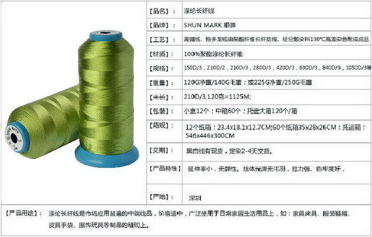 特多龍線的優(yōu)勢:順牌高強線,重視拉力、捻度、色準度及色牢度的檢測,產品質量層層把關;選用美國道康寧硅蠟潤滑線體,上油率要求達標3%左右,以保證車縫性能;自設染廠,最低量每款顏色12個起訂,最快樣品一天交貨。