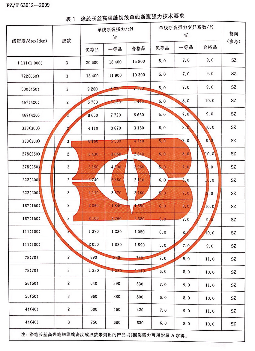 1、滌綸線縫紉線的要求分為內(nèi)在質(zhì)量要求和外觀質(zhì)量。內(nèi)在質(zhì)量要求:包括單線斷裂強力、單線斷裂變異系數(shù)、線密度允許偏差率、耐皂洗色牢度、耐摩擦色牢度、結(jié)頭個數(shù)、長度允許偏差率。其中單線強力見下圖表述: