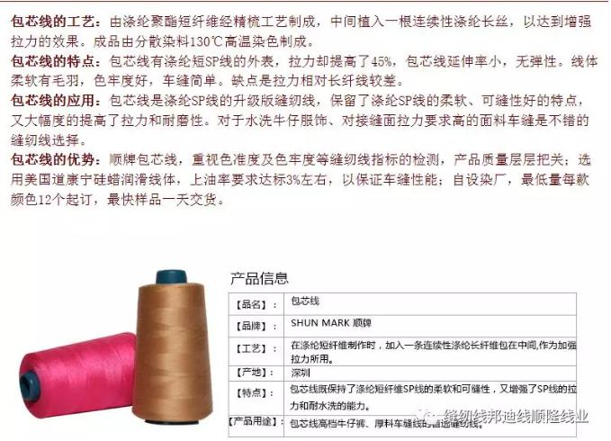 滌綸包芯線:在不影響滌綸線(棉線)外觀及質(zhì)地的情況下,在滌綸線的基礎(chǔ)上,中間加入一條滌綸連續(xù)徐長纖維,達(dá)到增加拉力30-40%的目的,加上精梳工藝,減少毛羽的數(shù)量。達(dá)到一種拉力更好、品質(zhì)更優(yōu)的新款滌綸縫紉線,請記住它的名字:滌綸包芯線。