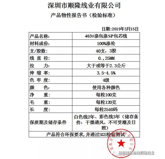 最后舉例來看看403#滌綸包芯線的性能指標(biāo),也就是《驗(yàn)貨標(biāo)準(zhǔn)》。