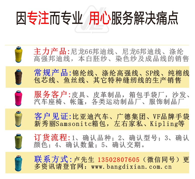 【尼龍66邦迪線的應用】:1、雙針、高速電腦車選用,輕松解決散股、斷線難題。2、較硬加厚面料,如拉桿箱、汽車安全帶、氣囊之縫紉線的選擇;3、皮具、鞋、沙發(fā)、手袋的車縫線,能提高產品質感!